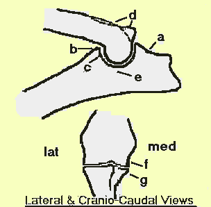 following findings: Additionally - in cranio-caudal radiographs osteophytes are most easily seen on the distal, medial part of the humeral condyle (f) and the medial part of the coronoid process (g).